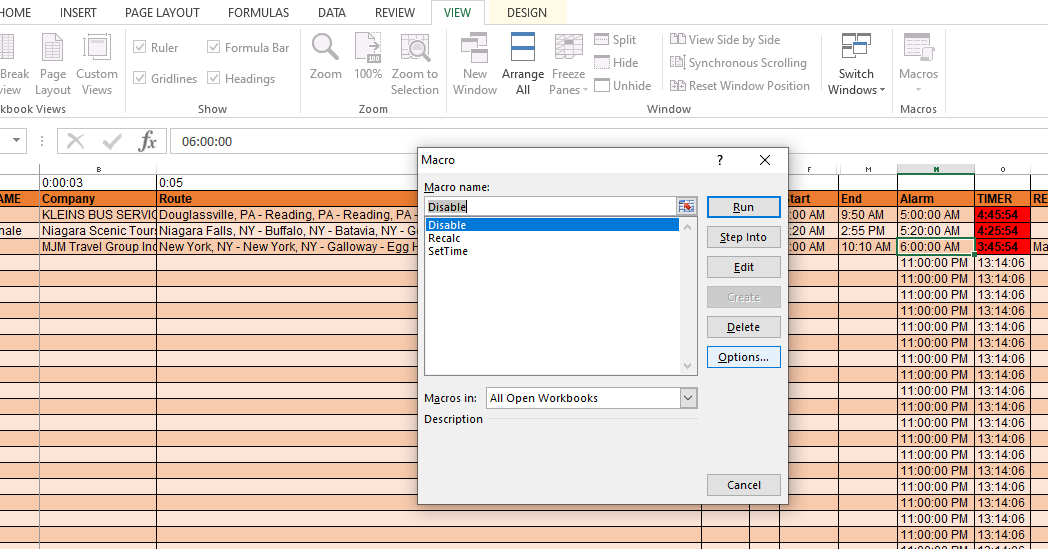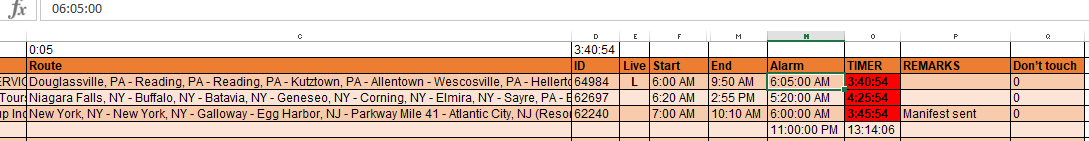 For example - In the screenshot below, for trip ID 64984, the departure time from Reading, PA is 6:25 am, so the alarm is set for 6:05 am