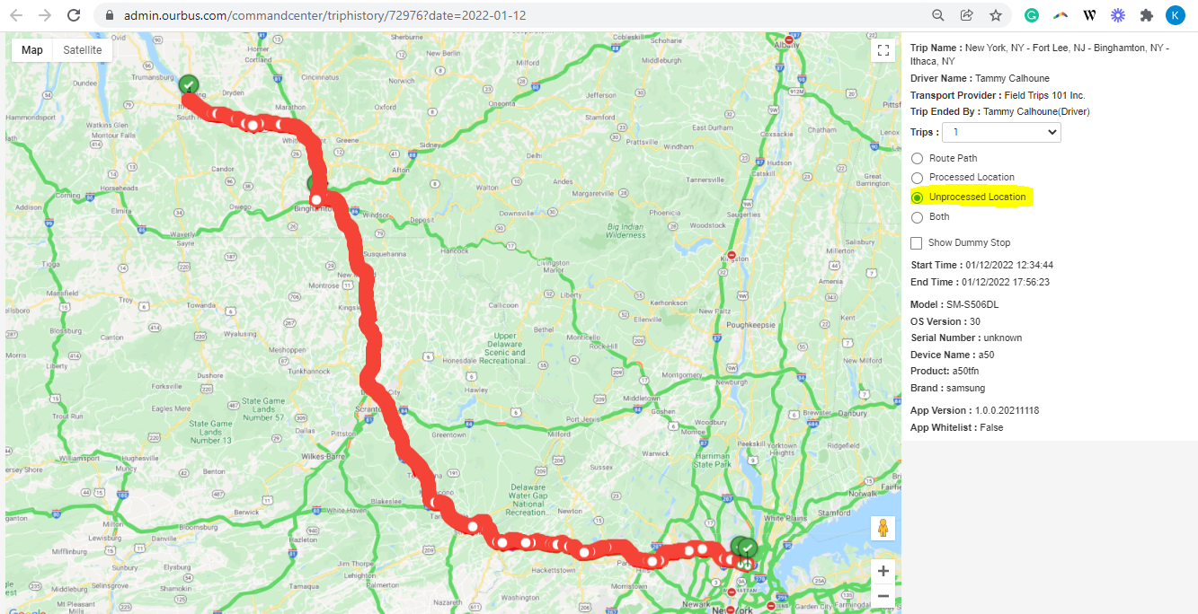 Click on the ‘Unprocessed location’ option to see the breadcrumbs of the traveling history which was not updated in real time (if there is any part of the history missing)