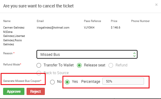 7. When you choose ‘Missed bus’ as the reason, the refund mode option changes to ‘Release Seat’.