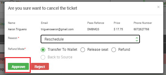 When you choose ‘Reschedule’ as the reason, the refund mode option changes to "Transfer to Wallet." (If the customer prefers a refund and the ticket was purchased through the OurBus platform, please choose the refund mode option as “Refund”).