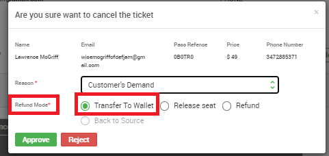 When you choose 'Customer’s Demand' as the reason, the refund mode option changes to 'Transfer to Wallet.'
